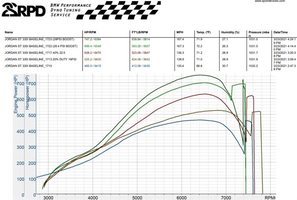 Now, take a look at how the power curve changed throughout the session, from our baseline of 465whp to the final number of 747whp!
