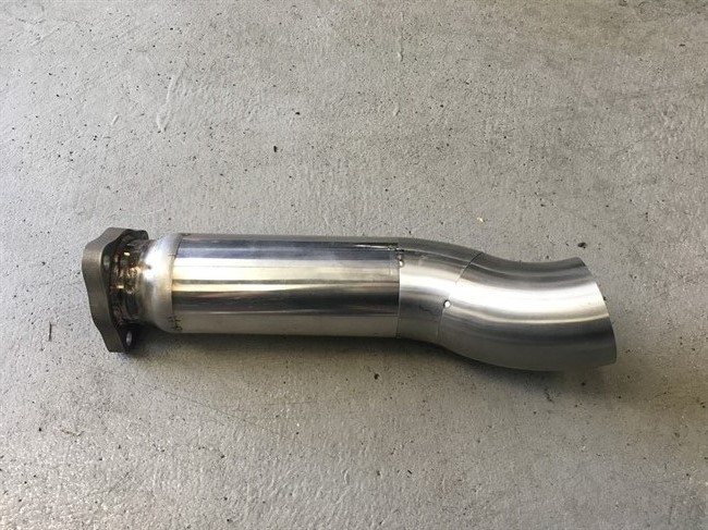 I started by drafting up and laser cutting a flange to match the outlet of my TD06H-20G turbo, and welded on a 2.5" to 3" transition section. From this point back, the exhaust will be 3" in diameter. After test fitting and making some cuts to the piping bends, here is part of the downpipe coming to fruition: