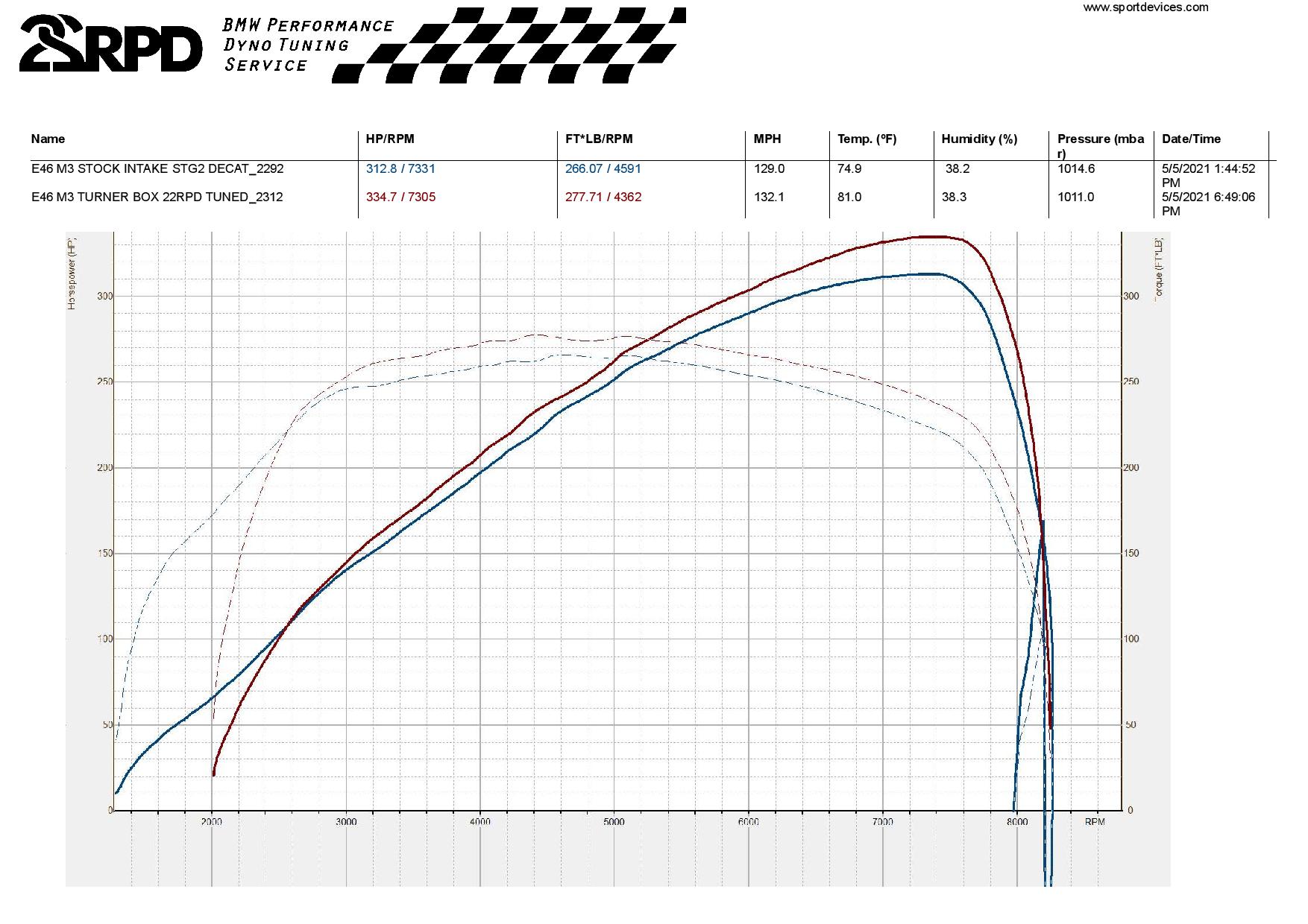 Already making 312whp in Stage 2 form, the M3 put down 334whp through the TMS airbox for a gain of +22whp and +12wtq!